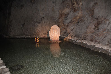 横穴から入ると資料などの展示が続き、第1岩屋に到着する。スケールの大きな洞窟のなかには、 亀石