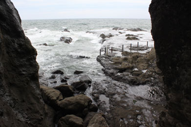第1岩屋と第2岩屋間は歩道橋で結ばれ、その下方向に亀石が見える。潮位によって見え隠れする 第2岩屋
