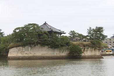 の島があり、その3つめの島に建てられている。各島間は、朱塗りの小さな橋で結ばれている。
