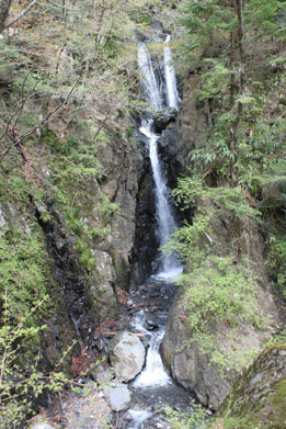 梅ヶ島温泉の先を10分ほど歩いた場所にある。落差30mくらいの滝で、見た目には2段にも見え る。上段と下段は大きな滝で右斜めに流れ落ち、中段は小さな滝で左斜めに流れ落ちている。