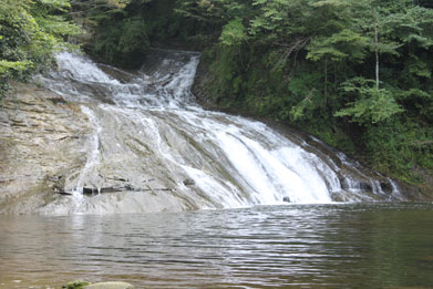 場所:千葉県大多喜町、市原市 養老川沿いに形成された渓谷で、滝めぐりコース、バンガロー村・弘文洞跡コース、大福山・梅ヶ瀬 粟又の滝 落差30m、全長100mのなだらかな滝で、メインの滝となっている。川幅が広く、水が滑り落ちるよ
