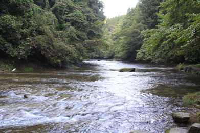 滝めぐりコースの風景 ほとんど傾斜がなく、川幅が広くゆっくりと流れ落ちるような景観である。1周4kmのコースとなって