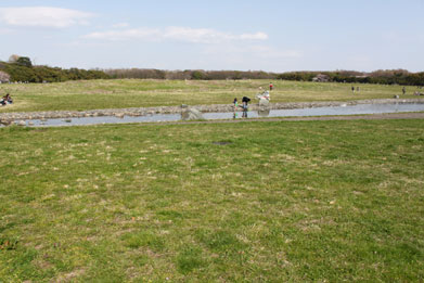 クや遊具などがある。せせらぎ広場や中央広場では、周囲が木々で覆われた広大な芝生が広がり、