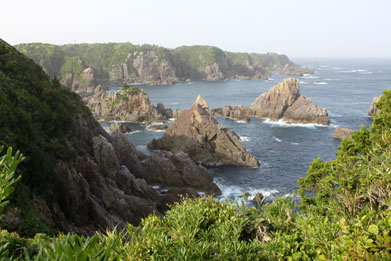 日米修好記念館から歩いた所にある。岩石が海岸から突き出したような景色が広がっている。鋭く 尖った巨岩も見え、荒々しく迫力のあるような景色である。このような岩石がそそり立つ海岸線を海 金剛と呼んでいる。その反対側も展望が出来、こちらも岩石がたくさん突き出たような景色ではある が、穏やかで静的な感じの景色なっている。