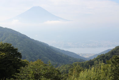 その隙間の右下の方には河口湖が見え、左上には富士山をかなり標高の高い位置から展望するこ