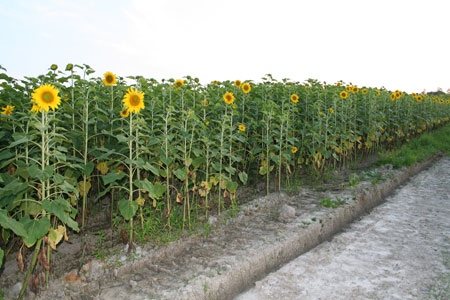 18万平方メートルの敷地内に100万本のひまわりが植えられている。 各ブロックごとに開花時期が異なっているため、夏の約1ヶ月間ほどひまわりの花を楽しむことが出来る。 展望台や見晴台もあり、上から見下ろすことも出来、その景色は雄大で、とてもきれいで すばらしい。 ひまわりの花が見ている人に対して、何かパワーでも与えているような感じを受ける。 途中にはダチョウとたくさんの鴨も飼育されている。 |
