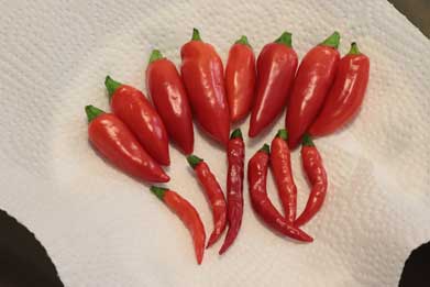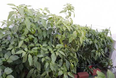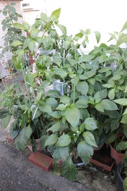 虫に食べられてばかりいたため、新たに小さな防虫ネットを購入してかぶせてみました。やっと少しずつ、パプリカらしい色が付き始めてきました。今のところ、虫食いの被害はなさそうです。来月当たりに収穫出来そうです。 【トウガラシ】
