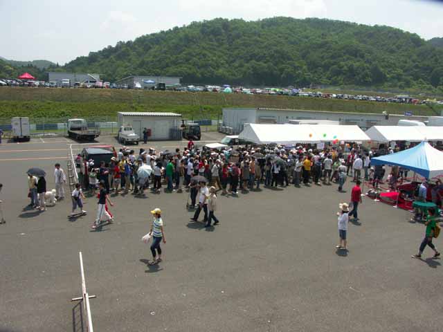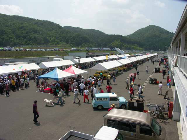 ピット裏のパドックはこんな感じです。 右側のテントの下は998チャレンジという っくらすの車がずらっと並んでいます。 左側のテントはショップ村やバザールのテントです。 ここには移ってないけど食べ物系は左の手前の方に 休憩テントと共にあります。 |