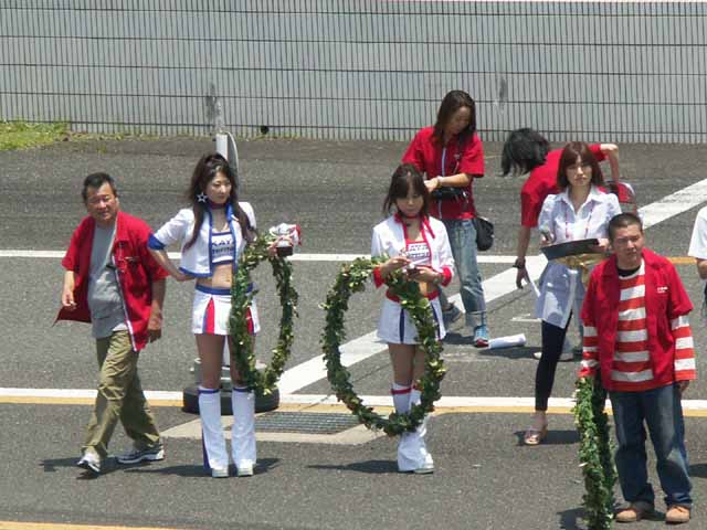お約束でクイーンも載せておきましょう。 このお二方、前回来たときと同じ方のようで・・・。 任期は何年なんでしょうね? 右手にいるマイク持ってる女性は実況の方です。 レース中はコントロールタワーの中でしゃべってました。 |