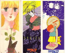 | 12、栞・他 〜小学館が書店においていた栞を手に入れて から、コバルト文庫等にはさまれていた栞をとって おくようにw PIC:小学館栞。左2つが「前略ミルクハウス」 右が「聖14歳グラフィティ」 |