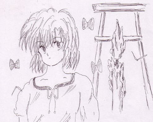 ”虚”の前に儚げに立つ繭姉ちゃん。