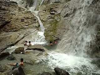 一見、ごく普通の滝。しかしここから歩いて5分程上流に源泉があるんです。 そして滝壷まで行くと、下の写真の様に浸かって?、いるんです。けして修行している訳ではありません。! 秘湯は秘湯なんでしょうけど、何か観光化されていたような感じでした。