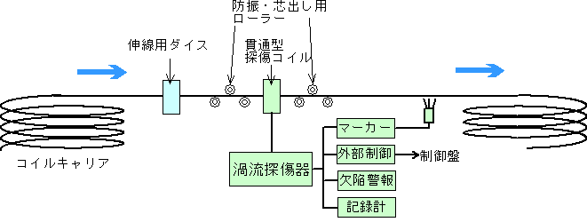 【貫通式渦流探傷器によるワイヤー・パイプ・バー材の外表面キズ検査装置】