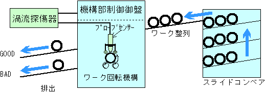 【プローブ式探傷器による部品(ベアリングレース)のキズ・ワレ選別検査装置】