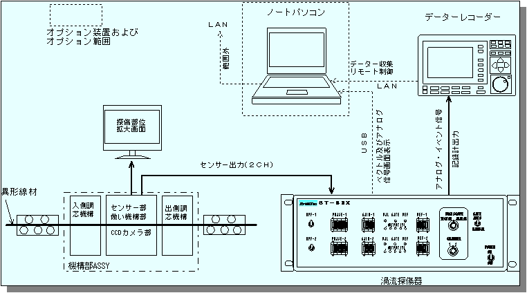 自動車部品等に使用される異形線材のコーナー部に発生する各種のキズをオンライン上 検査するための2チャンネル式プローブ型渦流探傷器です。