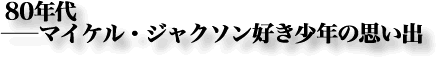 80年代、僕にとって最大の出来事はマイケルを見るための渡米、そしてマイケルの来日だった。87年、アルバム「BAD」を出した彼はワールドツアーのスタート地点に日本を選んだ。夢のような事だった。空港に行ったり、追っかけのようなことはしなかったが、コンサートには何度も足を運んだ。今度のコンサートでは、はっきり肉眼で彼の存在を確かめることが出来た。それは何よりも感動的なことだったが、それと同じくらい嬉しいことがあった。テレビでの報道を通じてではあるが、彼のプライベートの姿を見ることが出来たことだ。遊園地で遊んだり、玩具屋に行ったり、新幹線に乗ったり…、大統領に招かれた時ですらはずさなかったトレードマークのサングラスをはずして、マイケルはカメラの前で笑っていた。「日本では優しい声で、穏やかにしゃべる人が尊敬されるんだよ、アメリカとは大違いだ」マイケルがそんなことを言っていた。遥か遠くに存在すらしていないように感じていた彼を初めて近くに感じ、彼が気に入ってくれた日本という国に生まれて良かった、…マイケル好き少年だった僕は大げさでなくそんなことを感じていた。