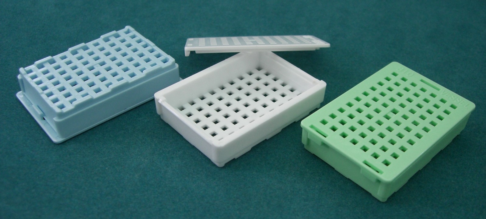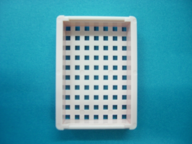 ■従来のカセットに比べ内容積が大きくなりました。 ■薬液入出孔も液の流通を考慮し、カセットとカセットが密着しないよう縦横に突起を付け蓋との間に溝をつけました。 ■裏面の周りに突起を付け、薄切時パラフィンの剥離ズレを防ぎます。 ■本体と蓋の間に溝が有り、流水性を考慮した作りになっています。 ■丈夫にできており、更に蓋は前後どちらからも装着できます。 ■パラフィン包埋には専用のベッセルトレー又は包埋皿Ⅲ型をご使用下さい。 ■他メーカーの包埋皿も使用出来ます。(※一部メーカー除く)