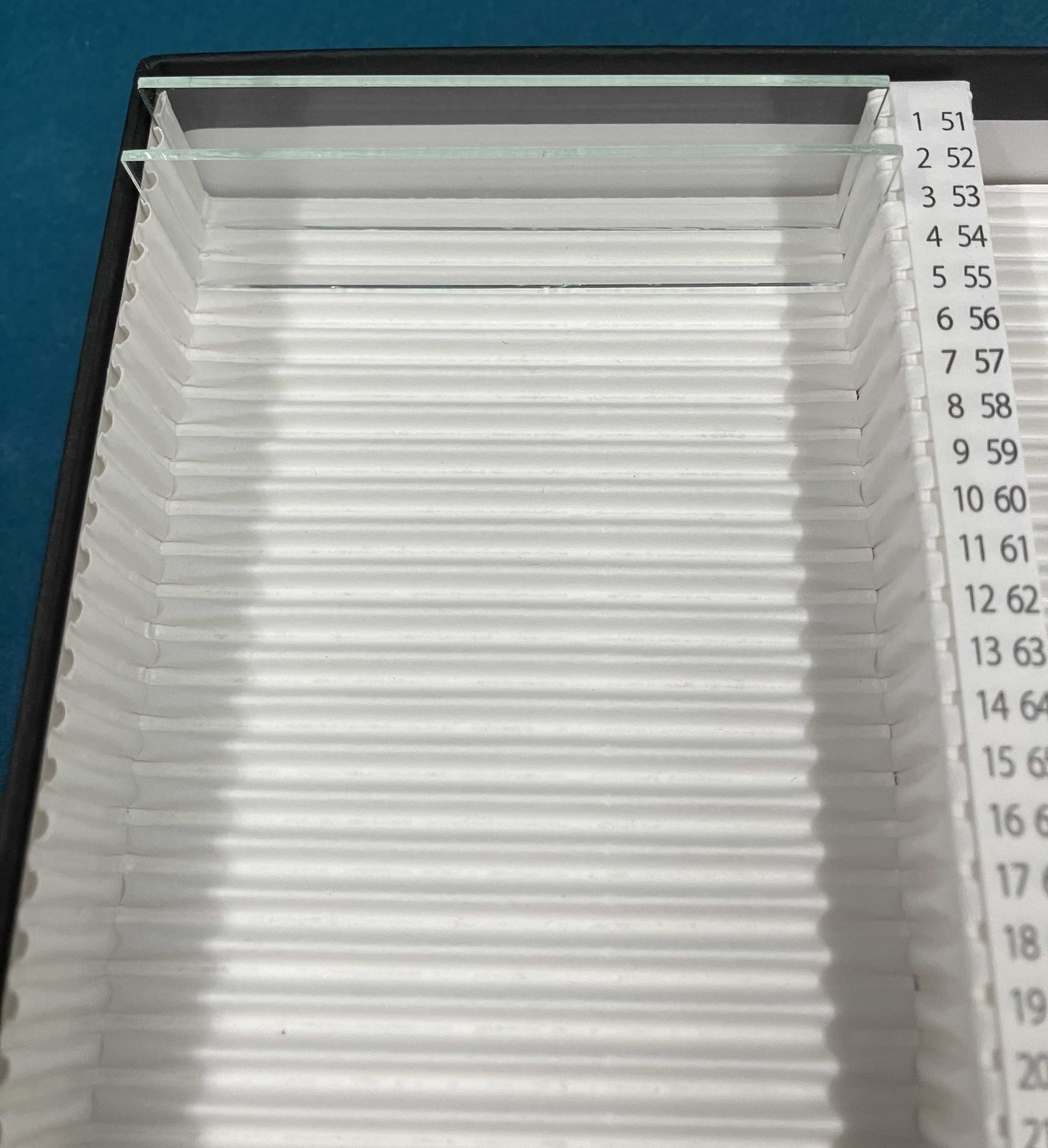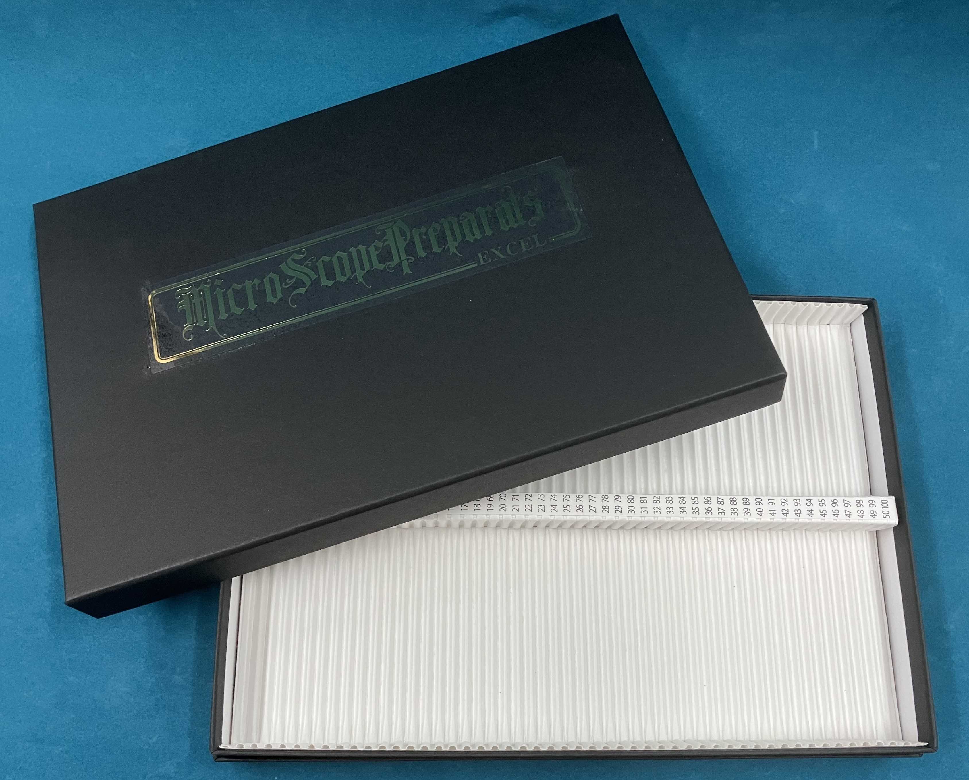 ■1箱で100枚のプレパラートが保管出来ます。 ■硬質の紙製で丈夫です。 ■プレパラートの整理や保管に便利です。 ■環境にやさしいプラスチックフリーです。 ■標本箱の中には番号表示シートが入っているので数字、文字等を記入できます。 ■保管時には、スリーブ(付属品)をご使用下さい。