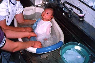 平成10年2月9日 (自宅の台所にて) 翔タンをベビーバスにつけて 翔タンパパと翔タンママが、 二人がかりで沐浴しています。 |