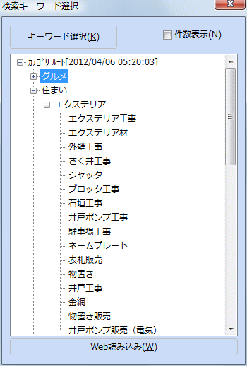項目を選択してキーワード選択ボタンをクリックするかキーワードをダブルクリックすればキーワードが選択できます。