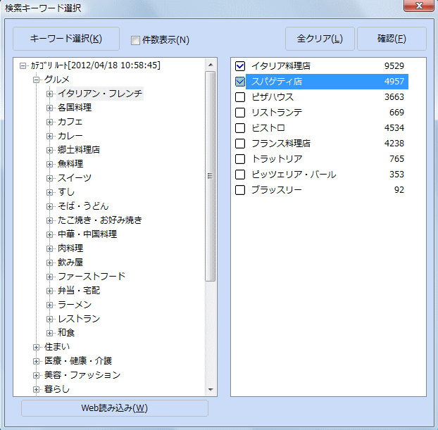 キー検索では自由にキーワードの設定を行うためこのデータの読み込みは必要ありませんが、その他の検索では検索前にデータの読み込みが必要です。