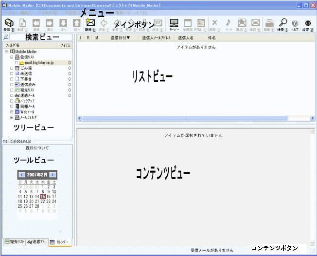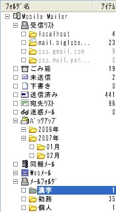 ツリービューでは以下の操作を行います。 表示フォルダの切り替え ツリーのアイテムをクリックすることで表示フォルダ(リストビュー及びコンテンツビュー)を切り替えます。 メール受信 受信リストのアイテムをダブルクリックすることでそのサーバーのメールを受信します。 メールのコピー、移動 リストビューからアイテムをドラッグ&ドロップすることによってアイテムの移動、削除ができます。 コンテキストメニュー ツリービューのアイテムを右クリックすることによってコンテキストメニュー(フォルダメニュー)を表示します。 フォルダメニューは選択しているアイテムの種類によって異なります。 | ||||||||||||||||||||