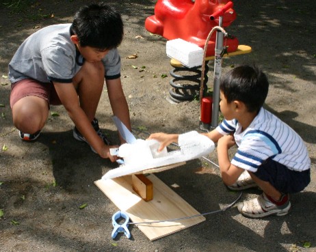 ボディは発泡スチロール製、車輪は糸巻き車の原理を応用した