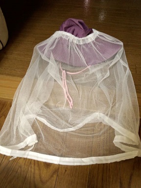 | 日射病を防ぎますし、スズメ蜂も怖いですよね。 メッシュっぽい明るめHatを使って首も焼けないようにしています。 虫に刺されないように、ホームセンターで購入したネットも付けてます。 ![]() |
