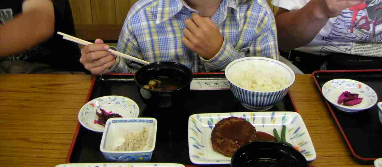 食事は,うわさ通りのハンバーグ。それも弁当ではなく定食の形を