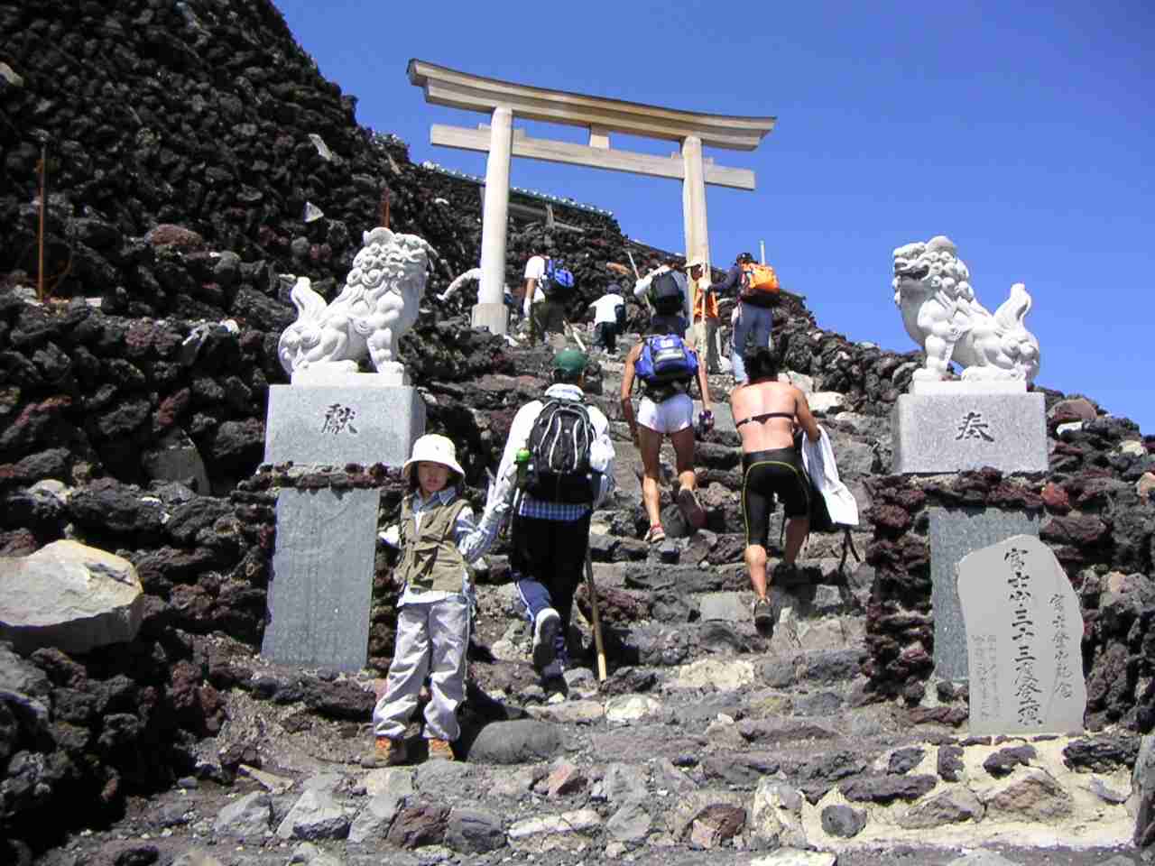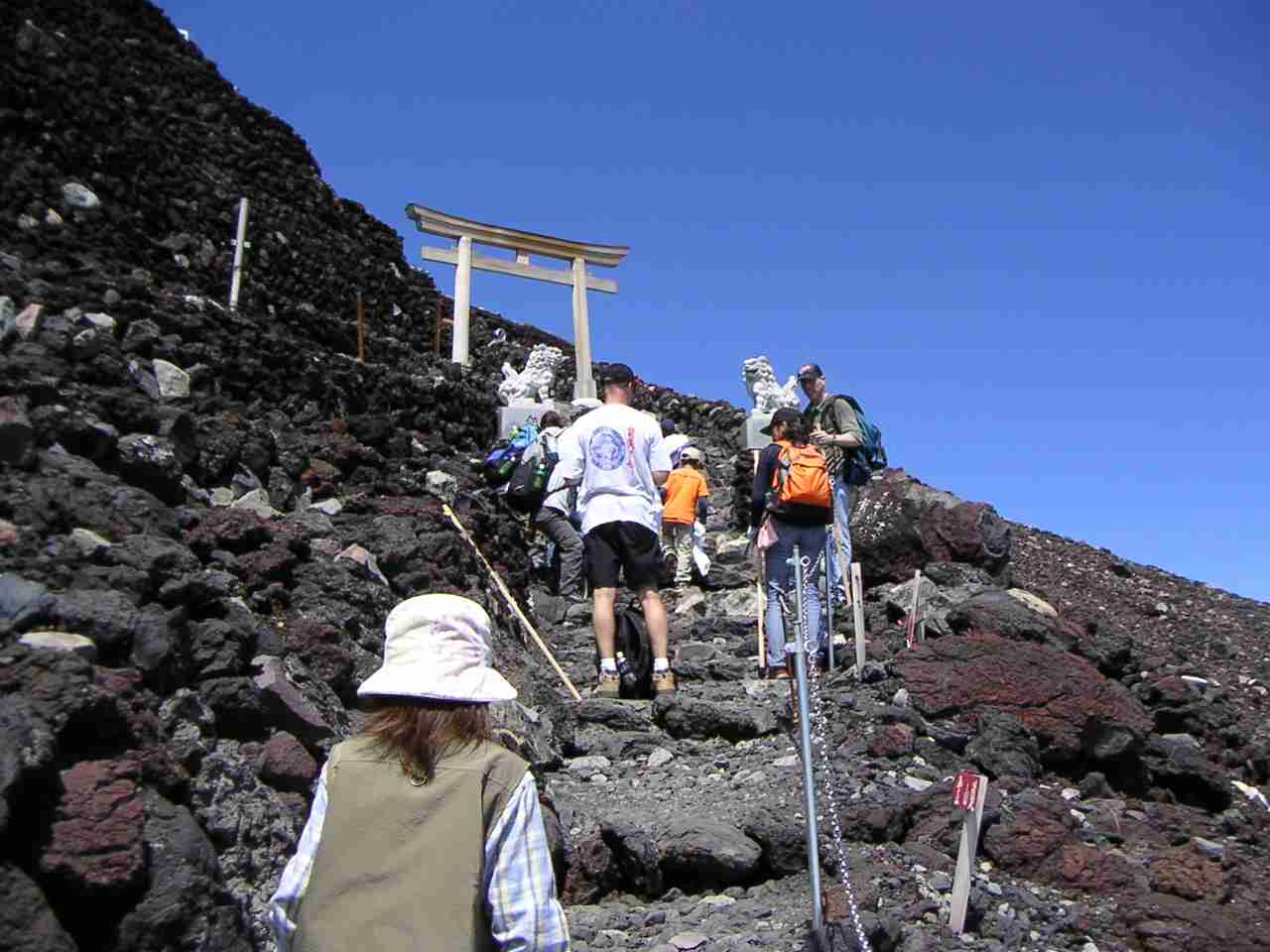 ようやく見え始めた本物の山頂の鳥居を見た娘は,