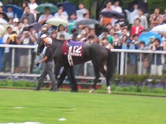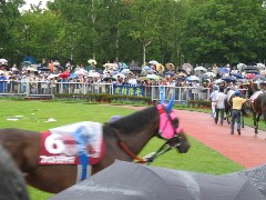馬がパドックぐるぐるまわるのを10分くらい見てるうちに、雨が強くなる。それにつれて、先週に比べるとうるさくなかったダンスインザムードとかコイントスがうるさくなる。さらに雨が強くなるので、退散。馬券を買う。