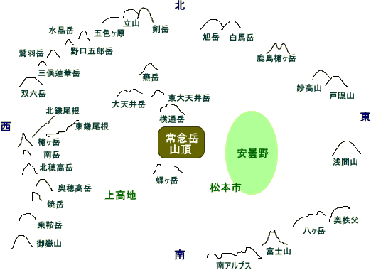 | 常念岳山頂からの展望(山の位置)概念図 |