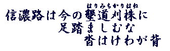 | 現代訳 信濃路は今、切り開いたばかりの道です。切り株に足を踏み抜かないように、 靴を履いて行ってください。あなた。 解説 東国(現在の中部から東)地方の庶民が詠んだ歌である。その頃、道は、 まだほとんど整備されていなかった。 江戸時代の街道の原点が現れるのが、万葉集の編者と言われる大伴家持 が活躍していた時代から100年ほど後である。その当時、開墾されたばかり の信濃路を通って都へ行くのは危険に満ちた旅だったろう。沓(くつ)=履物 全般、おそらくわら靴かわら草履だっただろう。これを用意する妻の無事で帰っ て欲しいという気持ちが伝わる歌である。当時、信濃路を通って都へ行ったり していた東国で、別れの時歌われた民謡のような歌かもしれない。 |