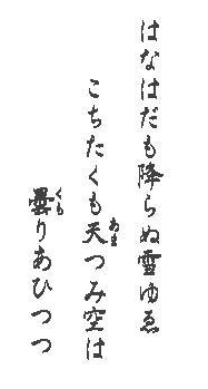 | 現代語訳 そんなにたくさんは降らなかった雪なのに、 大空をみるとひどく曇っている事だ。 解説 冬、太平洋側の関東より西は、雪はそれほ ど積もらない。しかし、降っている時は、かなり 雲は低く立ちこめて暗くなっている。昔も今も、 それは変わらない。 しかし、昔の着物は大袖と呼ばれる、袂の所 が今のように袋状ではなく、袖のところがしまっ ていなかった。庶民に至っては貫頭衣の重ね着 が多かった。夏はともかく、さぞ冬は寒かっただ ろうと思われる。今の小袖(振り袖も小袖のうち) が現れるまでのおよそ500年は、寒い思いをし た事だったであろう。 |