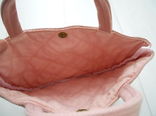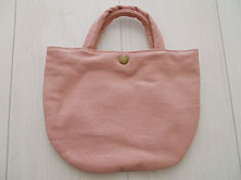刺繍のないほうの面に 2ミリ程度の茶色い うすじみが多数あります。 ピンクデニム素材に 持ち手も同素材 持ち手を除き縦15.5cm 口部分の最大値で横20.5cm マチなし 内側はピンク綿シーチングの キルティング素材 口部分にボタン止め |