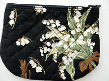 | 美品です 黒地に鈴蘭柄 綿ブロードのキルティング素材 内側は黒無地の綿素材 上ファスナー開き 縦13.5cm 横最大値17cm マチなし ロゴパッチ1個付き |
