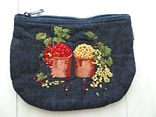 | 美品です ブルーデニムにベリー刺繍 上ファスナー開き 内側は水色にベリー柄のキルティング素材です(左写真) 縦13cm 横最大値17cm マチなし 耳タグ付き |