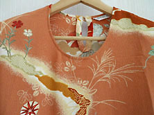 商品番号47B−0223 KI ポリ縮緬オレンジ朝顔柄 ワンピース&エプロン 12月14日値下げ¥6,050(税込み) |
