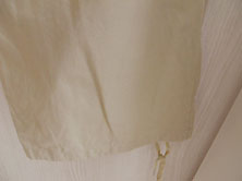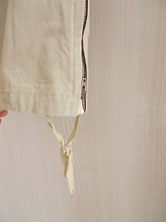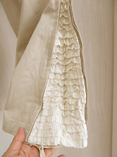 両脇は裾から39cmまで ファスナー開きになっています。 内側には三角形の キナリ綿ローン素材がついていて 総ピコフリル使いになっています。 (左写真) 裾にキナリの綿テープが 通っています。 |