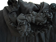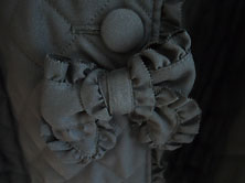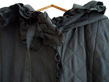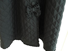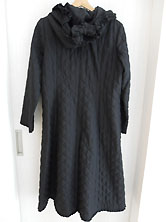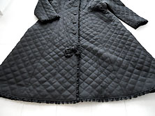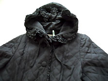 2022年 美品です クリーニング済み ポリエステル100% 黒 少し光沢のある すべすべした素材で キルティングしています。 裏地も全体に黒の無地が ついています。 丈111cm 身幅53cm 肩幅は肩山から肩山まで 直線で40cm 重さ1,078g 長袖 袖丈は肩から袖口まで60cm 脇から袖口まで42cm 二の腕幅19.5cm 袖口幅15cm フード付き フードには同素材のフリル付きで フリルにピンタックとピコフリル、 後ろ中央にピコフリルつきの リボンがついています。 (右上写真) えりもとと裾にも ピコフリルつきの リボンがついています。 前くるみボタン全開 ボタンは直径3.5cm 前ボタン脇〜裾にピコフリル付き |