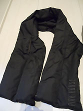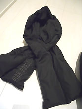 マフラーは幅19cm 長さ114cm 端に黒でロゴ刺繍入り 反対側にスリットが入っていて スリットにロゴ刺繍側を 通して使います。 |