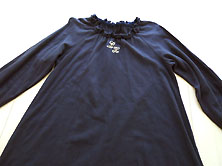 | 2022年 着用感少しありますが 目立つ難はありません。 綿100% 紺色 トレーナーの素材 丈103cm 身幅49.5cm 衿周りにゴム入りで 同素材でピコ刺繍のフリル付き えりもとに白で筆記体の ロゴ刺繍とピンクのお花刺繍 (左上写真) ラグラン長袖 二の腕幅21cm 袖口にゴム入りで 袖口フリルにピコ刺繍つき (右下写真) |