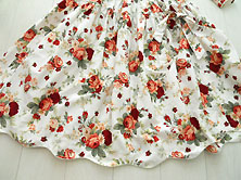 | 1998年夏 美品ですが 白い部分に若干の赤い 色移りがあります。 綿100% 白地に赤とオレンジの薔薇柄 綿ブロード素材 丈129.5cm 身幅49cm 衿周りにピコ刺繍 後ろウエストまで くるみボタン開き 前身頃は肩下からウエストの あたりまで横方向の 総ピンタック遣い マトンスリーブ 長袖 肩パット入り 二の腕幅22.5cm 二の腕切り替え部分幅12cm ゴム入りで少し伸びます。 袖口幅10cm 袖口にピコ刺繍 後ろウエストにゴム入りで ピコ刺繍のひもリボンが通って 前で結びます。 スカート部分は ウエスト下で2回切り替え 切り替え部分は少し 波形になっていて ピコ刺繍つき (右下写真) 裾はスカラップになっていて ピコ刺繍つきです。 |