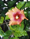 | 民家の庭からホテルやバーのカウンター、ドリンク、料理、新婚さん用のベット、レイからトイレの中まで・・・あらゆるところで一番目にする花。でも考えても見てると、こんな大輪のりっぱな ハイビスカス、日本でお金を出して買おうとしたら、一体いくらするのやら・・!(ビンボーくさい?)そう考えるとそんなナマの花を惜しげもなく、ふんだんに飾ってあるなんてすごい贅沢!よく見てみると、おなじみの真っ赤な大輪のものから、薄い色で中央が濃い色になったもの、小さい風鈴のような形のものなど、色や形、大きさなど実にさまざまな種類があった。 夕方には萎んでしまい、1日しか咲かないというのに、それでもよく見かけるのは、いかにこの花が多いかということか。色とりどりで大きな花は、まさに南国代表といった感じがする。 もうさんがとある家の垣根越しに大きなハイビスカスに見とれていると、そばにいた現地の女の子が、するすると枝を引き寄せて花を取ってくれた。もったいないような気がしたが、自然をアクセサリーに出来ることもまた、贅沢な気がしました。 | ||||