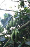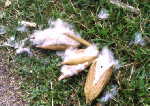 | やはりドライブ中、ある所に差しかかると、道に何かフワフワした物が飛んでいた。何だろうと車を降りると、そこら中に茶色くなって弾けた例の実が落ちていて、中からワタのような物が出ていた。これのフワフワを使うのか・・ホテルに帰ってじっくり観察しようと、それをGetして車に載せて走っていたら、窓からはいる風で、バラケだし車内をフワフワ漂いだした。うわっ!ぺっぺっぺっ!!ちなみに、このパンヤの木はカポックの仲間。 | ||