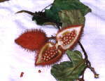 柔らかいトゲトゲの付いた実は、爪で押すと簡単に2つに裂け、中には赤いツブツブが・・。 そのツブツブを指で擦り潰すと、まるで朱肉のような鮮やかな朱色に染まった。 エクアドルのある少数部族はこの実をお化粧用に使い、髪を真っ赤に固めるのに使用したり、 またアマゾンではスープの赤い色付けに使用されたりしているそうだ。 | |