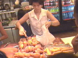 ![]() 左写真はお肉屋さん店頭にブラ下がった仔ブタちゃん(汗)。右は焼きブタ、トリ肉や肉の煮こごりを大胆に中華包丁で細かく刻んでの実演販売(?) 一食分くらいでも計り売りしてくれるのがウレシイです♪(煮こごり、大好物です!! *^¬^*) |