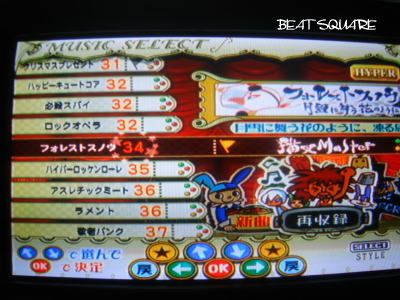 ◆CHART 各曲の、5ボタン、9ボタン、HYPER、EX、各譜面のハイスコア、MAXコンボ、プレイ回数の参照。 セレクトボタンで、表示項目切り替え。(ENJOY、COOL) ◆SECRET 隠し曲の解禁状況の参照。全部で3ページ構成。2ページ分、解禁曲。1ページ分、隠しEXPERTコース。 ◆EXPERT 各EXPERTコースの、トータルスコアの参照。各トータルスコアの、パスワードも参照可能。 ◆対戦成績 過去の対戦の戦績の参照。 ◆MINI GAME 各ミニゲームの、ハイスコアの参照。 ◆データクリア チャートに記録されているデータのクリア。 ◆MARATHON 各曲の、5ボタン、9ボタン、HYPER、EX、各譜面のハイスコア、MAXコンボ、クリアしたステージ数の参照。 |