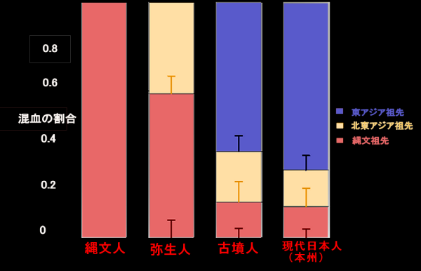 縄文人は独自の祖先成分をもっているのに対し,弥生時代には北東アジアを起源とする集団,さらに古墳時代には東アジアの集団が日本列島に渡り混血していった。そして,本州における現代日本人集団を調べると,古墳時代に形成された3つの祖先から成る三重構造を維持していることが分かった。