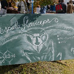 | 大会の案内チラシと日程表,各種掲示物.成虫が会場を飛び回っつているため注意書きも.ヘボの黒板アートも登場. | |||